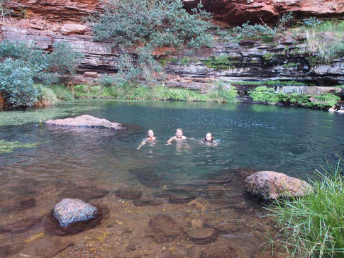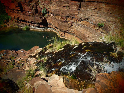 There are gorges and walks with different levels of difficulty dotted throughout the east and west of the Park. We concentrated on four of the more popular and challenging walks in the east section and we were not disappointed. Access to Circular Pool, Fortescue Falls and Fern Pool is via the same set of steep, leg cramping stone steps. The climb allows a quick (depending on level of fitness!!) descent into the bottom of the canyon, after which you hike in a more horizontal manner to each of the star attractions. Conversely, the track to Kermits Pool in Hancock Gorge takes a slower descent with more demanding and interesting obstacles along the way, including sections you need your bathers for and the ‘Spiderman walk’ where you crawl, sider-like, along the sides of a narrow section of rock wall. At each destination an impossibly deep pool of crystal clear water, fed by cascading waterfalls or seasonal streams, greets you. The long shadows created by the soaring cliffs prevent the sun’s warming rays from piercing the depths of these pools. Instead of hues that reflect the endless blue skies, the water shines like onyx. Some are so cold they take your breath away. Despite cool temperatures (in the low-mid 20’s), we all committed to a baptism in each pool. The experience was both refreshing and delightful. I could attempt to describe these amazing gorges but as they say “a picture tells a thousand words”. No amount of creative writing could match the impact of my photos. I apologise for the volume of shots but I hope they give you an appreciation of the beauty and excitement of the Park!